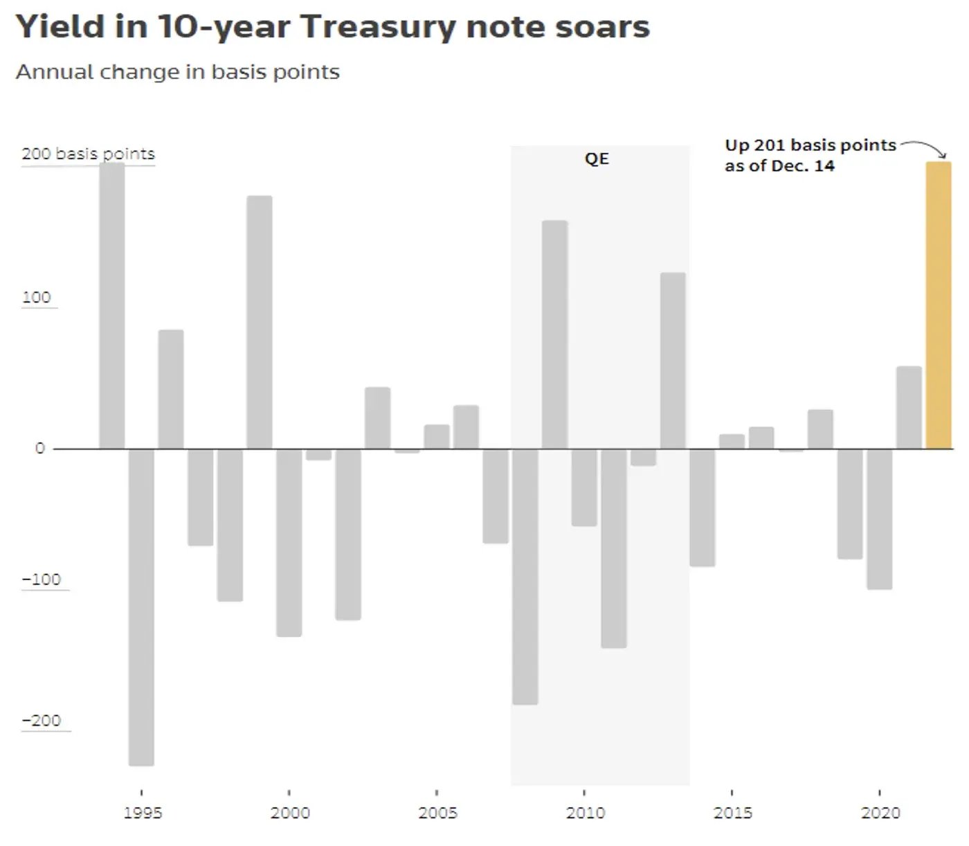 What were the reasons behind the poor performance of historic proportions? A perfect storm of sorts with historically low interest rates in an era of easy money colliding with the worst bout of inflation in a generation that forced monetary authorities to embark on a series of rate hikes the speed of which hadn’t been seen in decades.