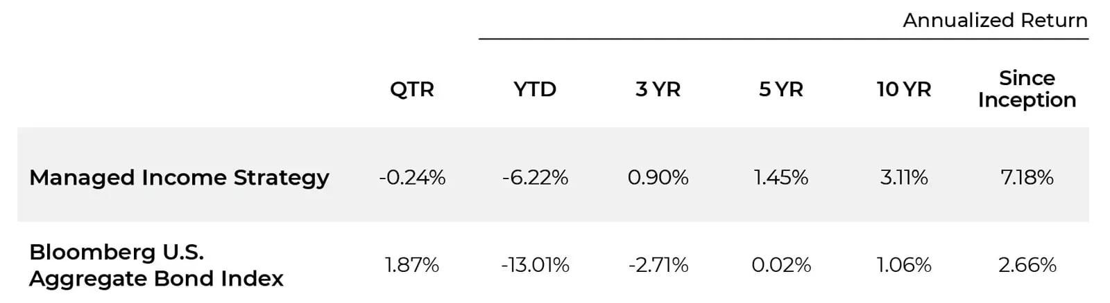 Performance: The Managed Income Strategy finished down -6.22% for the year compared to -13.01% for the Bloomberg Aggregate Bond Index (AGG) and -11.22% for the ICE BofA US High Yield Index (HY Index).