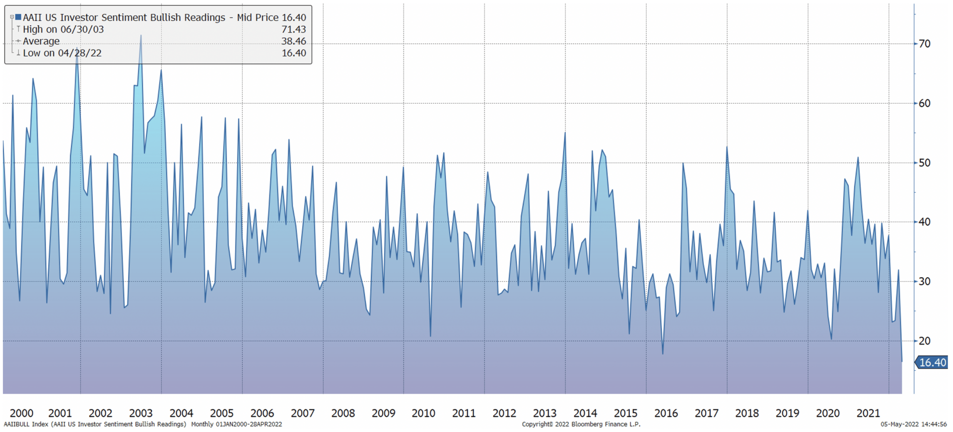 Not all selling was retail driven, however, with institutions contributing to the sell-off. In particular, risk parity funds were sellers as both stocks and bonds fell during the month. The widely used 60-40 benchmark portfolio (60% stocks/40% bonds) that has outperformed most active managers since the long-term secular bull market began in 1982 fell -7.07% in April and is now down -12.26% for the year. Bonds have historically acted as an excellent diversifier in long-term portfolios over the past four decades. This has mainly been a result of the long-term decline in interest rates and its corollary inflation over that period. Now that inflation is once again rearing its ugly head, investors can no longer rely on bonds to play that role.