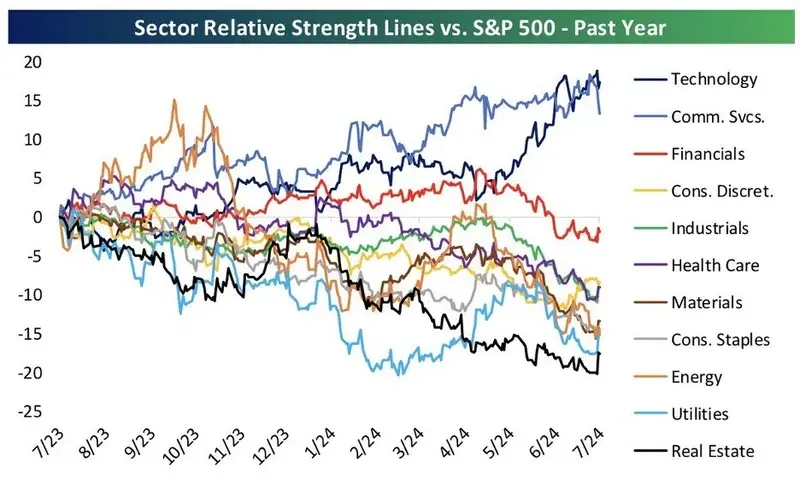 The first half of 2024 for U.S. equity markets, particularly large caps, has been defined by advancing indices with very limited breadth. Of the 11 sectors that make up the S&P 500, only two have outperformed the index over the past year (chart below): Technology and Communication Services (which is technology-heavy). While markets have benefitted from these sectors’ strong performance, it has also created significant concentration, leaving markets vulnerable should tech underperform.