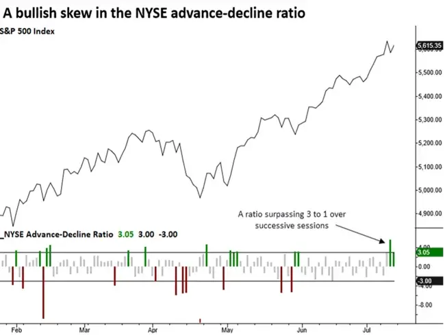 The shift is not just confined to small caps. In the first half of 2024, the S&P 500 had been buoyed by the performance of a small number of stocks. In fact, the top 10 biggest stocks in the S&P 500 contributed to 77% of the index’s total return through June. However, the recent surge in small caps has also coincided with a rotation within the S&P 500. For only the 26th time since 1936, advancing issues on the NYSE outpaced declining issues by a ratio of 3 to 1 over successive trading sessions last week (chart below), expanding breadth within the S&P 500 to its strongest reading since April.