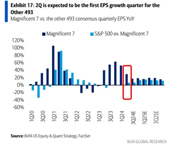 While all of this is potentially a positive indicator for market strength going forward, this recent push has been predicated on optimism for Fed rate cuts in September (a long way away) and will likely need to be supported by improved Q2 earnings if it is to continue. Outside of the Magnificent 7, S&P 500 earnings have been flat to down for the past five quarters, justifying their underperformance over the past two years. Q2 is expected to mark the first growth quarter for the “Other 493” since Q4 2022 (chart below).