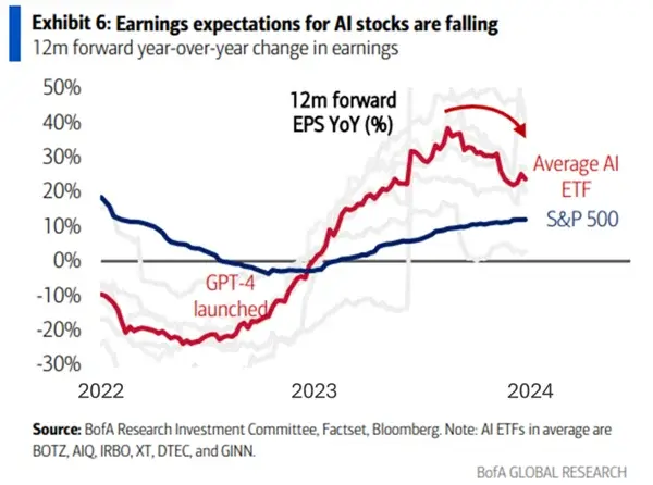 This improvement would come at a good time as earnings expectations for AI stocks, which have carried the market for a year and a half, are expected to decline going forward (chart below). A rise in earnings for non-AI-related companies is a best-case scenario for the bull market to continue.