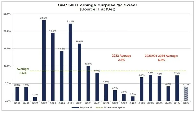 According to DataTrek Research, “The magic number for Q2 earnings season is a 6.6% earnings beat versus expectations. Given that U.S. large caps are near record highs, this is the bare minimum necessary to keep equity valuations at current levels.” While this number is certainly achievable (the average earnings surprise beat since 2019 is 8.6%) (chart below), given the higher earnings expectations this quarter, it is certainly not a given.
